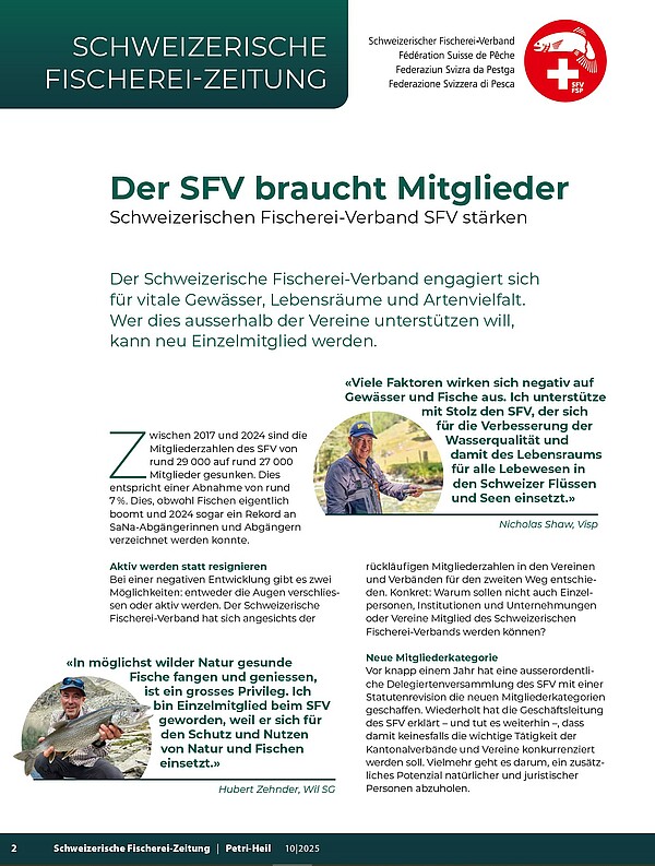Die Schweizerische Fischerei-Zeitung SFZ informiert über aktuelle News aus dem SFV. Sie erscheint 11-mal jährlich, gedruckt in der Zeitschrift «Petri Heil» und digital für unsere Newsletter-Abonnenten.